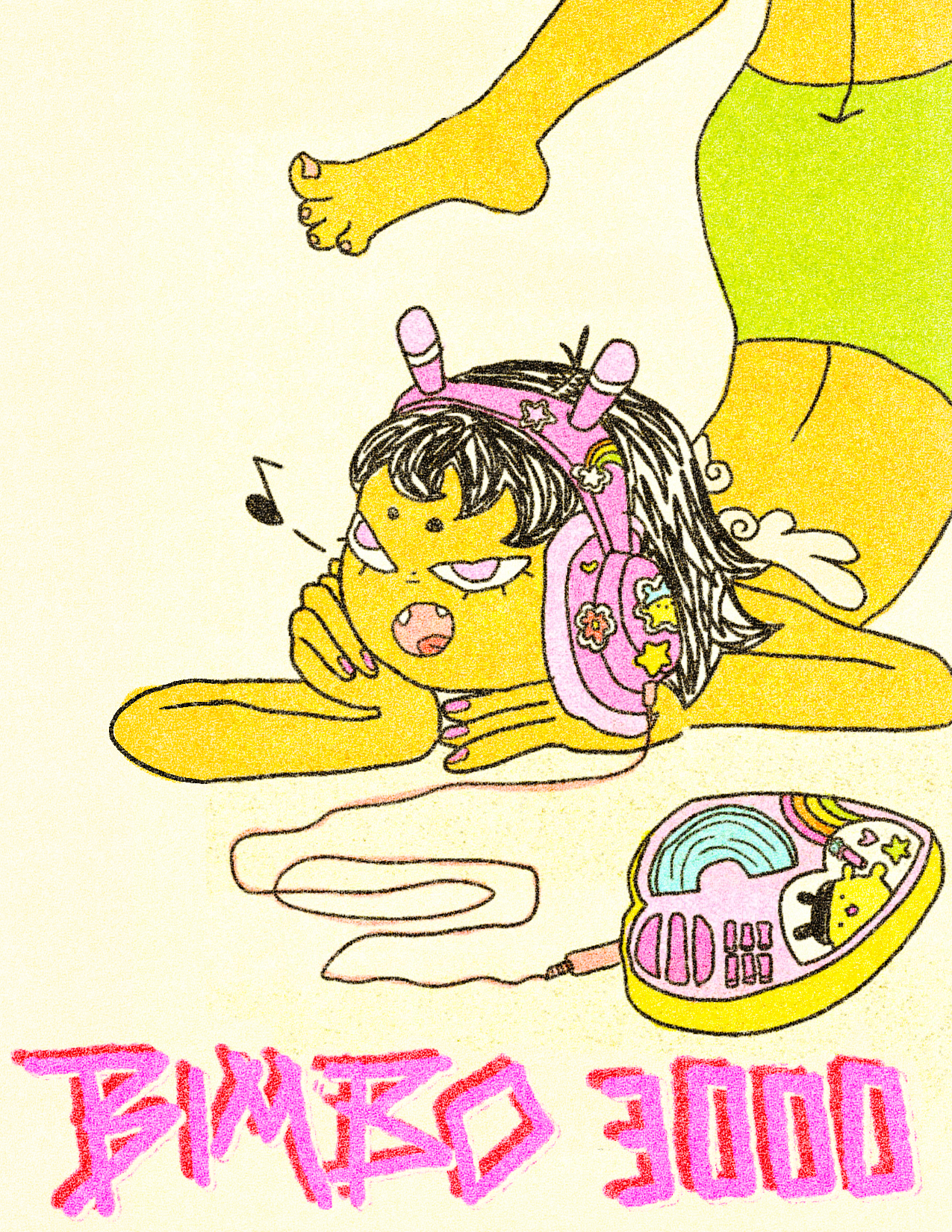 Mini Comic about a girl who falls deeply in love with a virtual pet/ mega icon. Love turns to obsession and she becomes indoctrinated into Bimbo's cult like fan club, and ultimately gives her very life to the mega corporation behind Bimbo 3000.